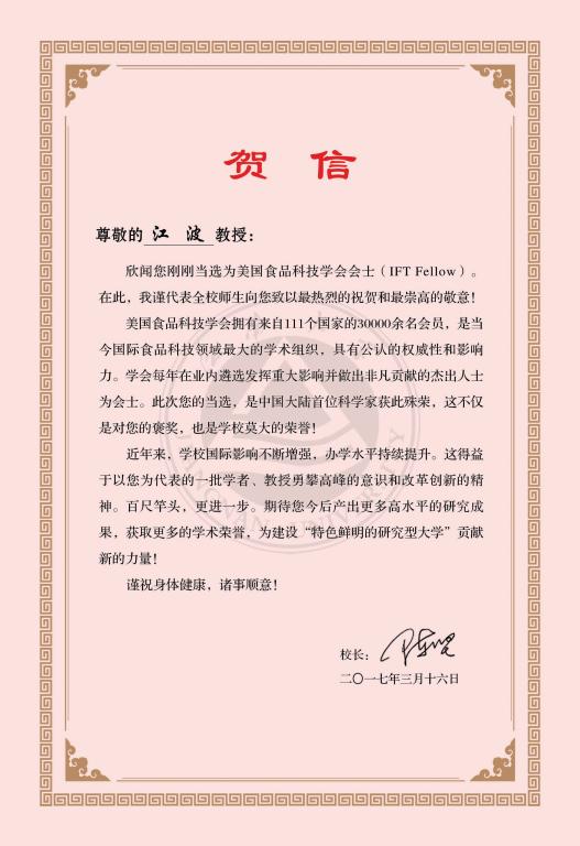 近日,从美国Institute of Food Technologists(美国食品科技学会,简称IFT)传来消息,我校江波教授当选为美国食品科技学会会士(IFT Fellow),在今年当选的8IFT Fellow中,江波教授是唯一一位来自非美国本土、也是至今第一位来自中国大陆的科学家。获知这一喜讯后,陈坚校长向江波教授发去贺信,向他致以衷心的祝贺。