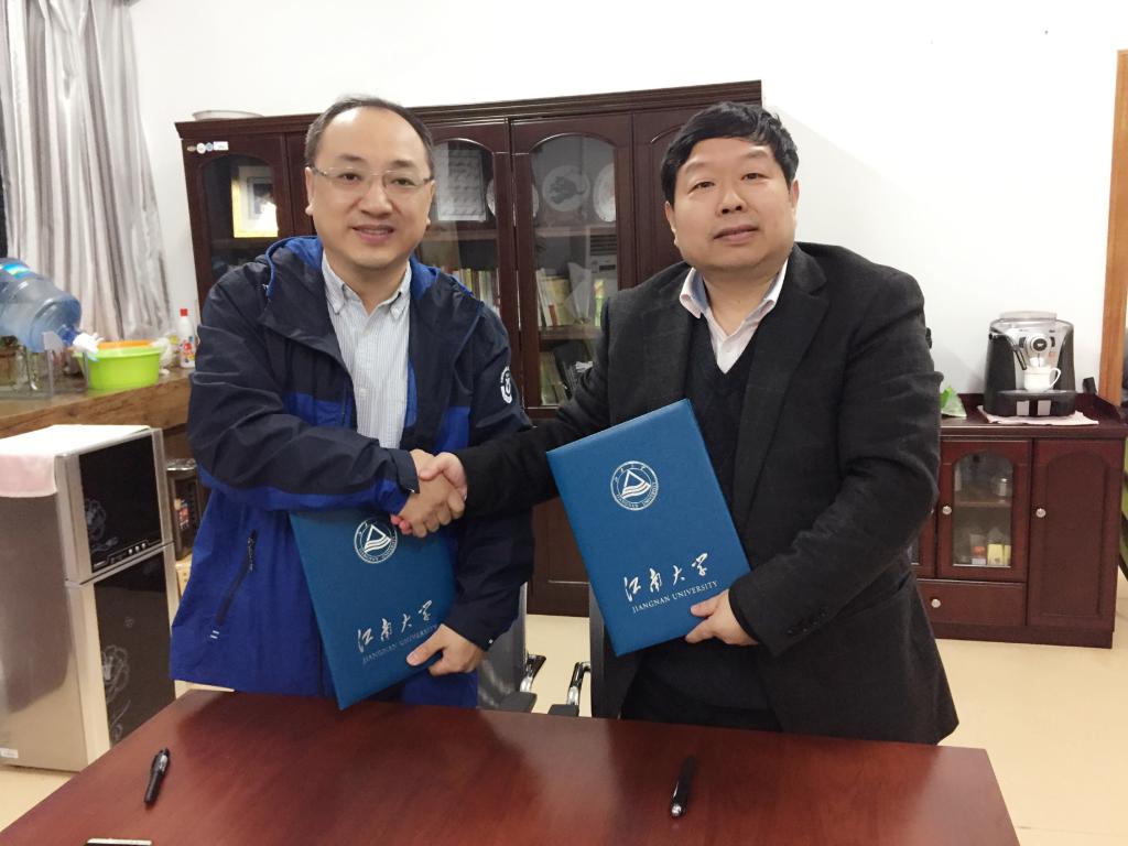 (图为王震宇教授与陈坚校长签约)